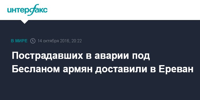 Москва. 14 октября. INTERFAX.RU - Пострадавшие в Северной Осетии в ДТП с участием автобуса "Москва-Ереван" граждане Армении доставлены спецбортом МЧС РФ на родину.