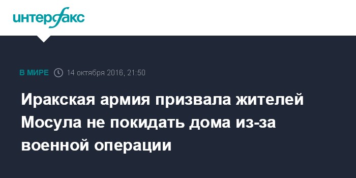 Москва. 14 октября. INTERFAX.RU - Начальник штаба армии Ирака Усман аль-Ганими призвал жителей Мосула оставаться дома в связи со скорым началом операции по освобождению города от группировки "Исламское государство" (ИГ, запрещена в РФ). Слова военачальника приводит турецкое агентство "Анадолу".