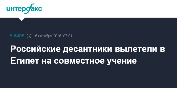 Москва. 15 октября. INTERFAX.RU - Военно-транспортные самолеты Ил-76 с десантниками и техникой на борту вылетели в Египет, где пройдет совместное антитеррористическое учение, сообщили "Интерфаксу" в Департаменте информации и массовых коммуникаций Минобороны РФ.