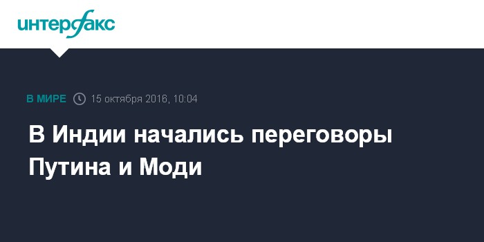 Москва. 15 октября. INTERFAX.RU - Встреча президента РФ Владимира Путина и премьер-министра Индии Нарендры Моди проходит в субботу в Гоа.