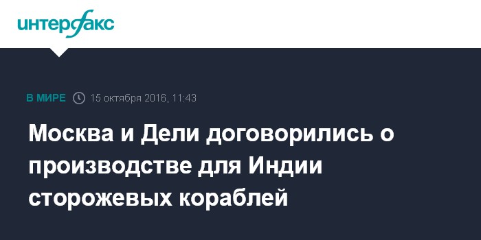 Москва. 15 октября. INTERFAX.RU - Соглашение о производстве в интересах ВМС Индии фрегатов проекта 11356 (многоцелевые сторожевые корабли - ИФ) подписано в субботу в Гоа по итогам встречи президента РФ Владимира Путина и премьера Индии Нарендры Моди, передает корреспондент "Интерфакса".