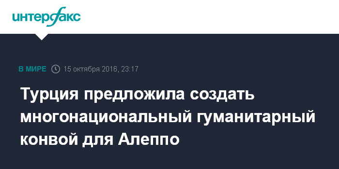Москва. 15 октября. INTERFAX.RU - Турецкая сторона на переговорах по Сирии в Лозанне предложила подумать о формировании многонационального гуманитарного конвоя для жителей города Алеппо, заявил в субботу вечером глава МИД Турции Мевлют Чавушоглу.