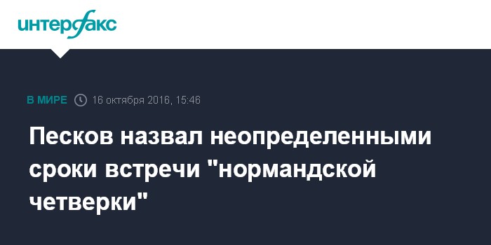 Москва. 16 октября. INTERFAX.RU - По дате возможной встречи лидеров "нормандской четверки" (Украина, Германия, Франция, РФ) по-прежнему нет ясности, сказал пресс-секретарь президента Дмитрий Песков.