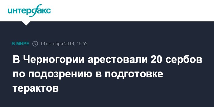Москва. 16 октября. INTERFAX.RU - Стражи порядка в Черногории в ночь на воскресенье арестовали группу из 20 лиц сербского происхождения, которые подозреваются в организации терактов на территории страны, передает агентство Associated Press.
