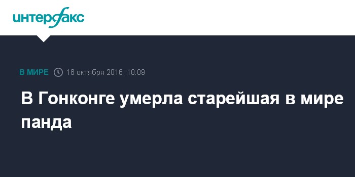 Москва. 16 октября. INTERFAX.RU - В тематическом парке Гонконга умерла старейшая в мире большая панда, содержавшаяся в неволе, сообщает "Би-би-си". Животному по кличке Цзя Цзя было 38 лет - это более 100 лет по человеческим меркам.