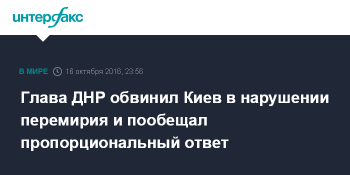 Москва. 16 октября. INTERFAX.RU - Глава самопровозглашенной Донецкой народной республики (ДНР) Александр Захарченко после покушения на ополченца Моторолу обвинил Киев в нарушении перемирия в Донбассе.