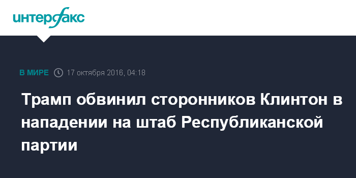 Москва. 17 октября. INTERFAX.RU - Кандидат в президенты США от Республиканской партии Дональд Трамп обвинил сторонников своей соперницы Хиллари Клинтон в нападении на отделение своей партии в штате Северная Каролина.