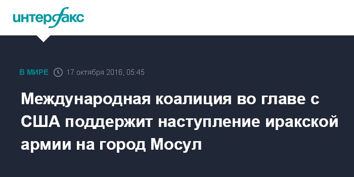 Москва. 17 октября. INTERFAX.RU - США одобряют наземную операцию иракской армии по освобождению Мосула от боевиков террористической группировки "Исламское государство" (ИГ, запрещено в РФ).