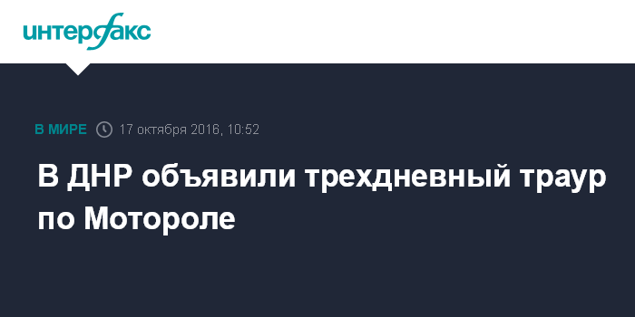 Москва. 17 октября. INTERFAX.RU - В самопровозглашенной Донецкой народной республике объявлен трехдневный траур в связи с гибелью одного из лидера ополчения Арсения Павлова, также известного как Моторола.