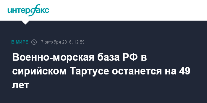 Москва. 17 октября. INTERFAX.RU - Постоянная база ВМФ РФ в сирийском Тартусе создается почти на полвека, сообщил "Интерфаксу" источник в российском парламенте.