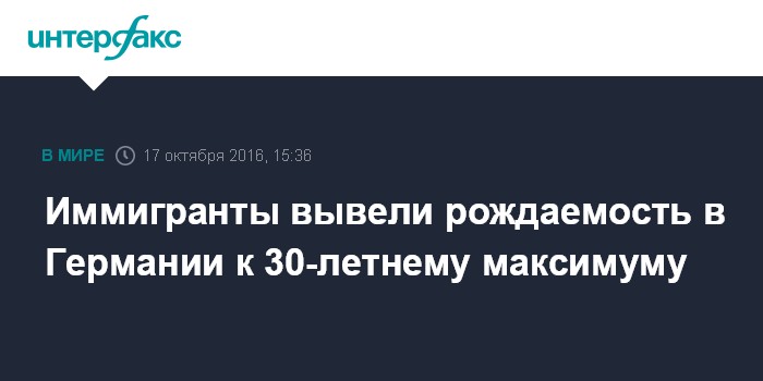 Москва. 17 октября. INTERFAX.RU - Уровень рождаемости в Германии достиг в 2015 году наивысшего уровня за последние 33 года, в основном за счет детей, родившихся в иммигрантских семьях, сообщило в понедельник издание Frankfurter Allgemeine Zeitung со ссылкой на Федеральное статистическое агентство страны.