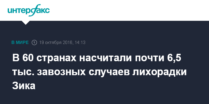 "Сообщается о 6447 случаях завоза ЛЗ (лихорадка Зика - ИФ) на территорию 60 стран и отдельных территорий, в том числе в 22 страны Европейского региона, США (3807 случаев завоза), Францию (1018 случаев), Новую Зеландию (97 завозных случаев), Австралию (44 случая), Китай (23 случаев) и ряд других государств", - говорится в сообщении, опубликованном в среду на сайте ведомства.