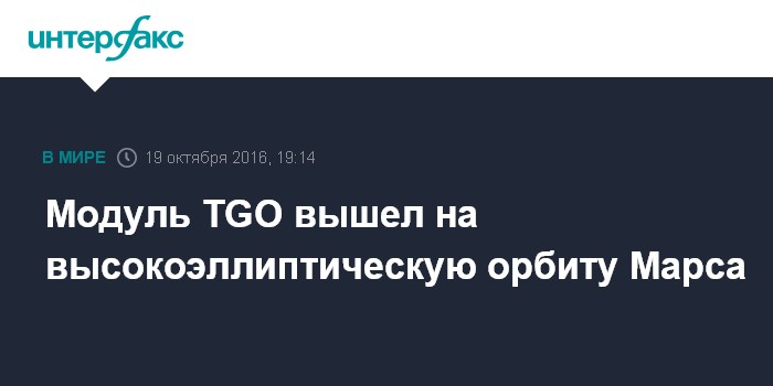 Москва. 19 октября. INTERFAX.RU - Орбитальный модуль TGO (Trace Gas Orbiter) вышел на орбиту Марса, говорится в сообщении Европейского космического агентства.