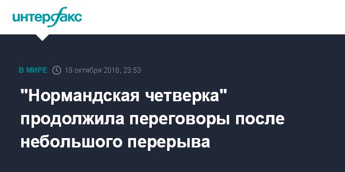 Москва. 19 октября. INTERFAX.RU - После непродолжительного перерыва делегации стран "нормандской четверки" во главе с лидерами Украины, Германии, Франции и России возобновили встречу, передает корреспондент "Интерфакса".