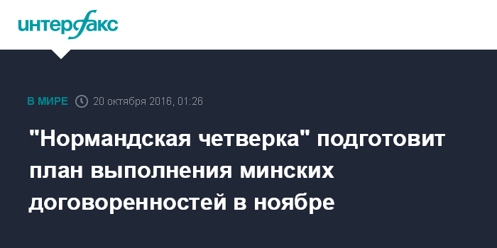 Москва. 20 октября. INTERFAX.RU - Лидеры стран "нормандского формата" на переговорах пришли к соглашению, что главы министерств иностранных дел подготовят "дорожную карту" по имплементации минских соглашений до конца ноября текущего года, затем ее подпишут главы государств, сообщил президент Украины Петр Порошенко.