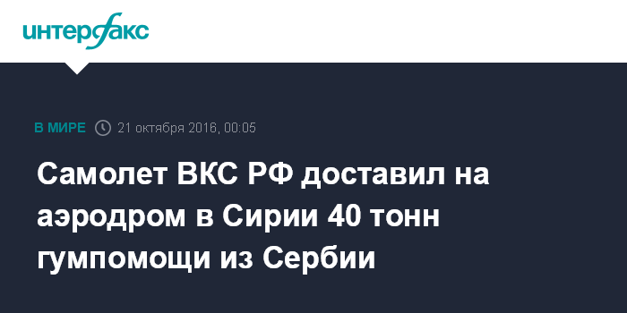 Москва. 21 октября. INTERFAX.RU - На аэродром Хмеймим в Сирии самолетом военно-транспортной авиации ВКС России доставлено 40 тонн гуманитарного груза из Сербии, сообщает в пятницу Департамент информации и массовых коммуникаций министерства обороны Российской Федерации.