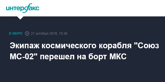Москва. 21 октября. INTERFAX.RU - Члены экипажа новой экспедиции открыли переходные люки и перешли с транспортного пилотируемого корабля (ТПК) "Союз МС-02" на борт Международной космической станции (МКС), сообщили "Интерфаксу" в пятницу в подмосковном Центре управления полетами (ЦУП).