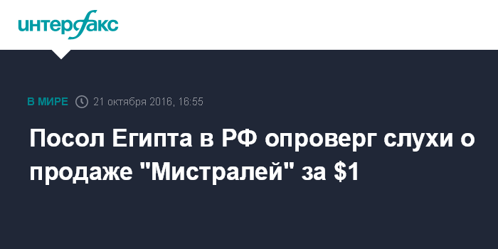 Москва. 21 октября. INTERFAX.RU - Посол Египта в России Мухамед Эль-Бадри не подтвердил сообщения о возможной продаже "Мистралей" России.