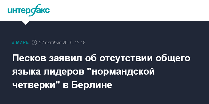 Москва. 22 октября. INTERFAX.RU - Пресс-секретарь президента РФ Дмитрий Песков по итогам встречи "нормандской четверки" в Берлине констатировал, что на данном этапе четыре лидера не нашли общего языка, хотя и продемонстрировали готовность продолжить работу в этом формате.