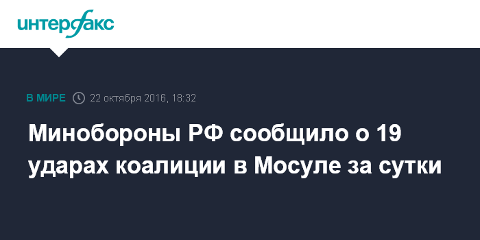 Москва. 22 октября. INTERFAX.RU - В министерстве обороны РФ заявили, что следят за операцией иракской армии и международной коалиции в Мосуле, за сутки там нанесено 19 ударов.