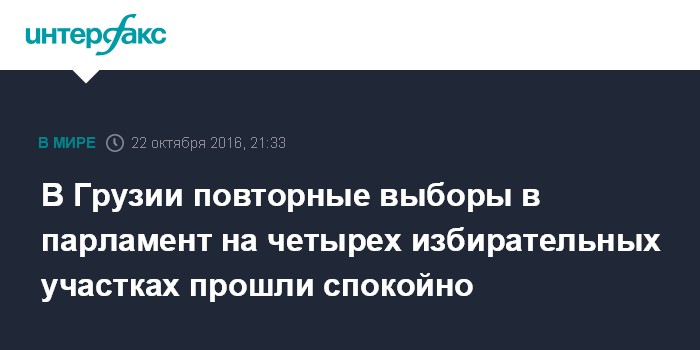 Москва. 22 октября. INTERFAX.RU - Повторные выборы в парламент Грузии на четырех избирательных участках в Марнеульском и Зугдидском районах прошли в спокойной обстановке, заявила в субботу вечером на брифинге спикер ЦИК Грузии Анна Микеладзе.