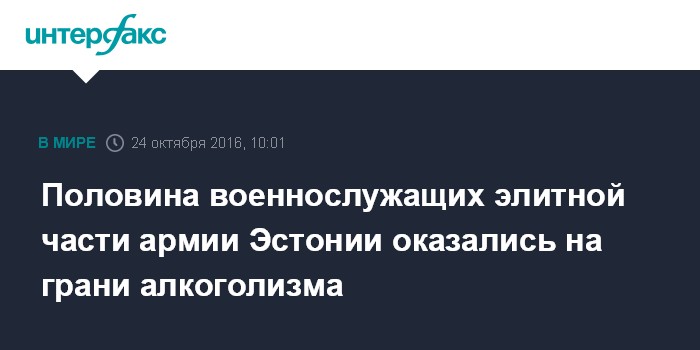 Москва. 24 октября. INTERFAX.RU - Половина военнослужащих разведывательного батальона Сил обороны Эстонии опасно много употребляют алкоголь, свидетельствует проведенное в вооруженных силах страны исследование.