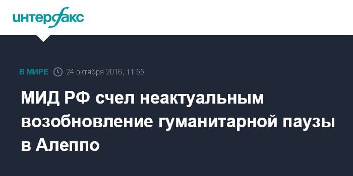Москва. 24 октября. INTERFAX.RU - В МИД РФ считают неактуальным вопрос о возобновлении гуманитарной паузы в Алеппо.