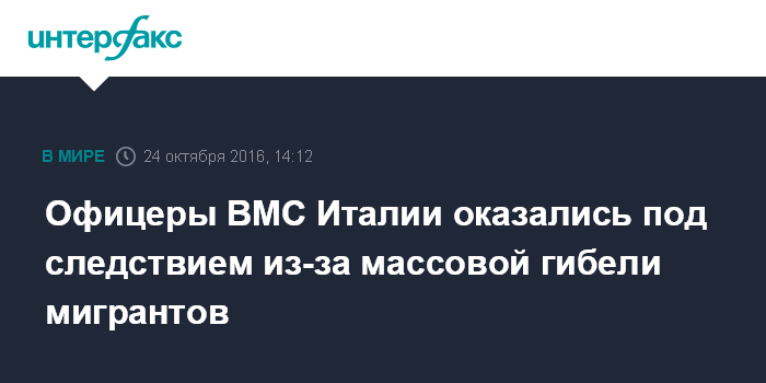 Москва. 24 октября. INTERFAX.RU - Нескольким офицерам итальянского военно-морского флота грозит уголовное преследование в связи с массовой гибелью мигрантов в 2013 году. Их обвиняют в несвоевременном оказании помощи тонущему судно, что привело к гибели более 300 человек. Об этом в понедельник сообщает The Times.