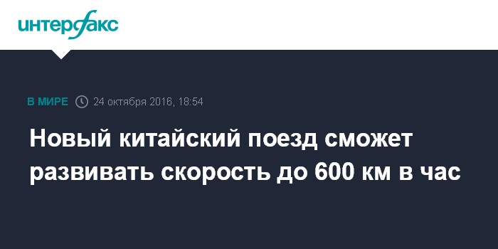 Москва. 24 октября. INTERFAX.RU - Крупнейшая китайская железнодорожная компания CRRC анонсировала создание нового высокоскоростного поезда, который сможет развивать скорость до 600 км/ч. Об этом в субботу сообщило агентство "Синьхуа".
