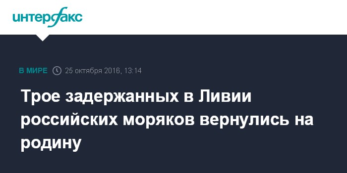 "24 октября после завершения судебного процесса в Триполи на родину вернулись трое российских моряков - А.Б.Крынин, С.В.Сироткин и B.А.Савицкий - из состава экипажа танкера "Механик Чеботарев", задержанного в Ливии в сентябре 2015 году. Все другие члены команды этого судна были возвращены в Россию в октябре-декабре 2015 года", - говорится в сообщении, опубликованном на сайте внешнеполитического ведомства во вторник.