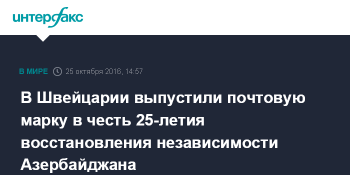 Москва. 25 октября. INTERFAX.RU - Почтовая марка, посвященная 25-летию восстановления независимости Азербайджана, выпущена в Швейцарии, сообщает пресс-служба азербайджанского посольства в Берне.
