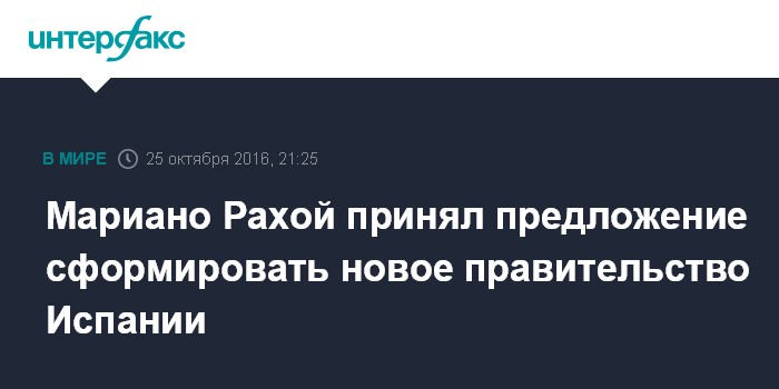 Москва. 25 октября. INTERFAX.RU - Исполняющий обязанности главы испанского правительства Испании, лидер Народной партии Мариано Рахой во вторник принял от испанского монарха Фелипе VI предложение о формировании нового правительства.