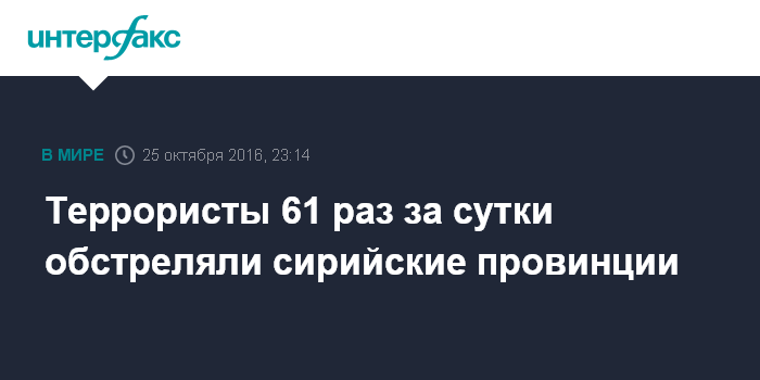 Москва. 25 октября. INTERFAX.RU - Сирии за сутки зафиксирован 61 обстрел со стороны боевиков, сообщили в министерстве обороны России. Отмечается, что вооруженные формирования, заявившие о прекращении боевых действий, из танков, реактивных систем залпового огня кустарного производства, управляемых ракет, ствольной артиллерии, минометов и стрелкового оружия в провинции Алеппо обстреляли населенный пункт Азизи и квартал Хай-эль-Антари в городе Алеппо.