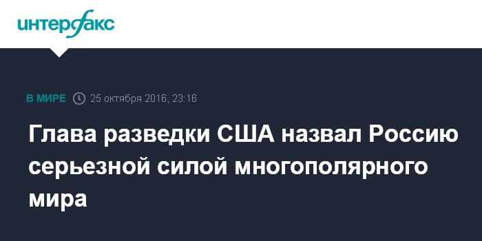 Москва. 25 октября. INTERFAX.RU - Мир переходит от биполярной конструкции к многополярной, в которой Россия считает себя значительной силой, заявил, выступая во вторник в Совете по международным отношениям в Нью-Йорке, директор национальной разведки США Джеймс Клэппер.