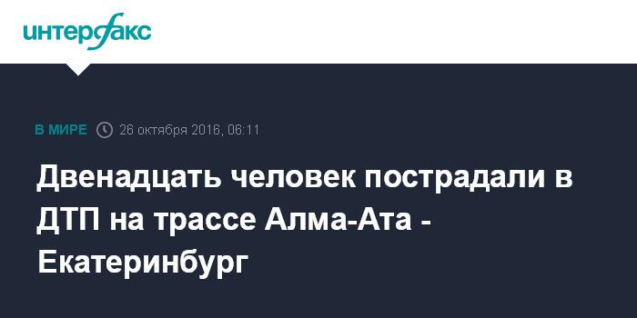 Москва. 26 октября. INTERFAX.RU - В Акмолинской области Казахстана на 1347 км трассы Алма-Ата - Екатеринбург в результате ДТП вылетел в кювет пассажирский автобус, сообщили агентству "Интерфакс" в областном департаменте по ЧС.