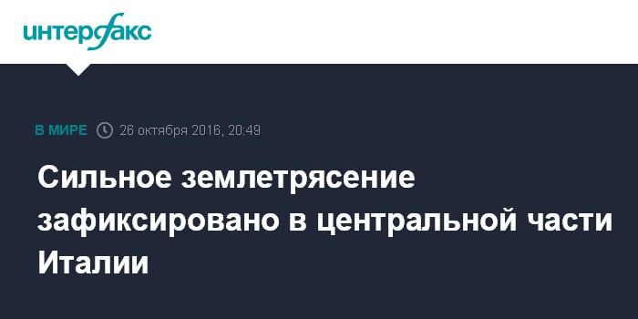 Москва. 26 октября. INTERFAX.RU - Землетрясение магнитудой 5,4 зафиксировано в среду в центральной части Италии - в областях Марке, Умбрия и Лацио, сообщает итальянский телерадиоканал РАИ.