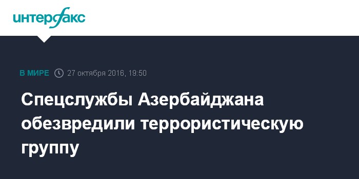 Москва. 27 октября. INTERFAX.RU - Служба госбезопасности Азербайджана (СГБ) 26-27 октября провела спецоперацию по задержанию членов радикальной террористической группы, в ходе которой были уничтожены двое ее членов, отмечается в сообщении службы.