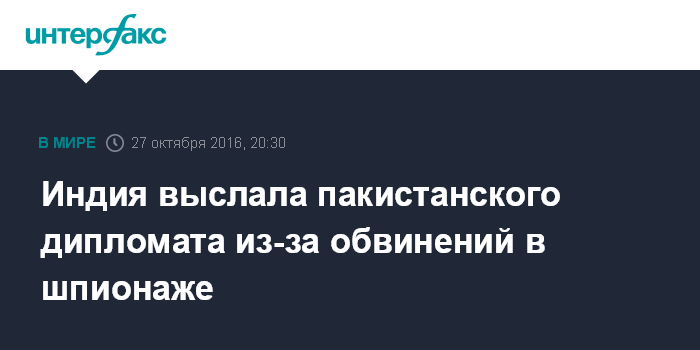 Москва. 27 октября. INTERFAX.RU - Индийские власти потребовали от сотрудника дипмиссии Пакистана в Индии покинуть страну в срок до 29 октября в связи с обвинениями в шпионаже в пользу Исламабада, сообщает в четверг агентство AP со ссылкой на МИД Пакистана.