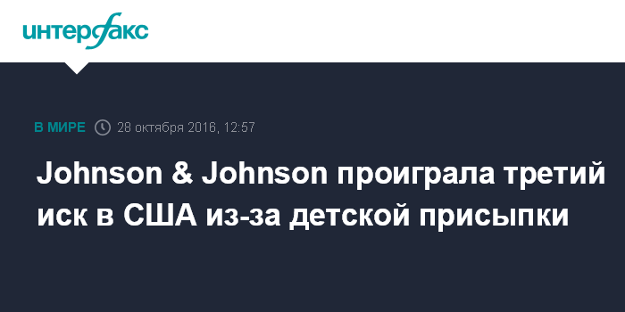 Как сообщает "Би-би-си", это уже третий иск о присыпке на основе талька, проигранный компанией. Ранее суд Сент-Луиса обязал Johnson & Johnson выплатить в общей сложности $127 млн по двум искам.