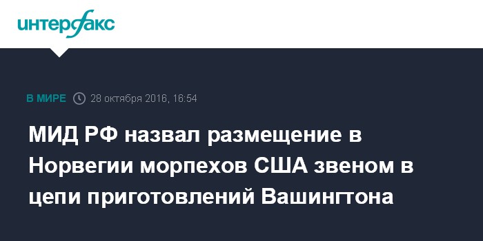 Москва. 28 октября. INTERFAX.RU - Решение Осло о размещении на территории страны 330 американских морских пехотинцев является очередным звеном в цепи военных приготовлений США и не способствуют сохранению стабильности на севере Европы, заявляют в МИД РФ.