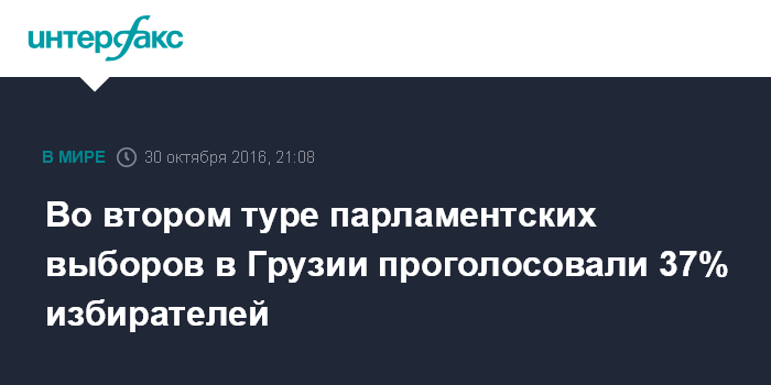 Москва. 30 октября. INTERFAX.RU - Явка в ходе второго тура парламентских выборов в Грузии, который состоялся в воскресенье, составила 37,5%, сообщила на брифинге спикер Центральной избирательной комиссии Анна Микеладзе.
