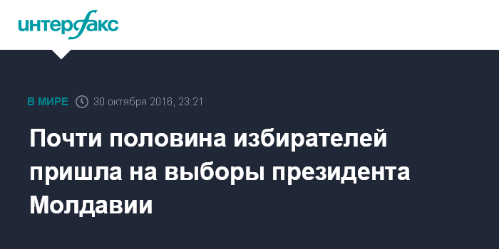 Москва. 30 октября. INTERFAX.RU - В выборах президента Молдавии приняло участие чуть менее 50% избирателей, сообщили "Интерфаксу" в Центральной избирательной комиссии республики.