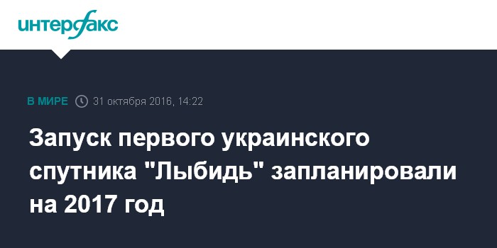 Москва. 31 октября. INTERFAX.RU - Украинский телекоммуникационный спутник "Лыбидь" может отправиться на орбиту с космодрома "Байконур" в конце 2017 года, сообщил "Интерфаксу" источник на космодроме.