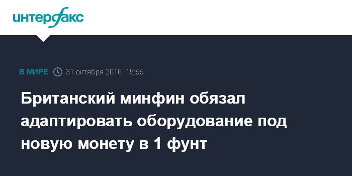 Москва. 31 октября. INTERFAX.RU - Британским компаниям надо подготовиться к вводу в обращение новой 12-гранной монеты номиналом в 1 фунт стерлингов, сообщило министерство финансов страны.