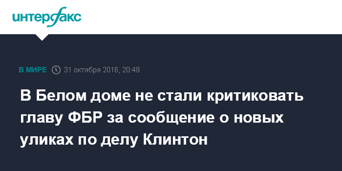 Москва. 31 октября. INTERFAX.RU - Белый дом воздерживается от оценки действий директора ФБР Джеймса Коми, обнародовавшего незадолго до выборов информацию о новых возможных уликах по делу Хиллари Клинтон. Об этом заявил в понедельник официальный представитель президентской администрации Джош Эрнест.