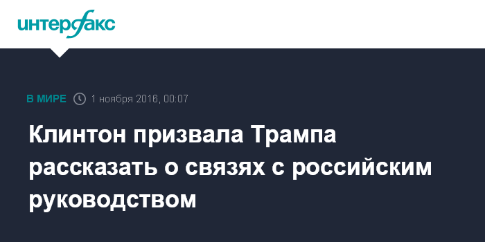 Москва. 31 октября. INTERFAX.RU - Кандидат в президенты США от демократов Хиллари Клинтон в понедельник призвала своего соперника, республиканца Дональда Трампа, признать, что у него есть связи с российским руководством.