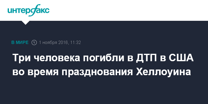 Москва. 1 ноября. INTERFAX.RU - Двое детей и взрослый, принимавшие участие в праздновании Хеллоуина, стали жертвами ДТП в американском городе Чанки на востоке штата Миссисипи, сообщает во вторник американский телеканал CBS.