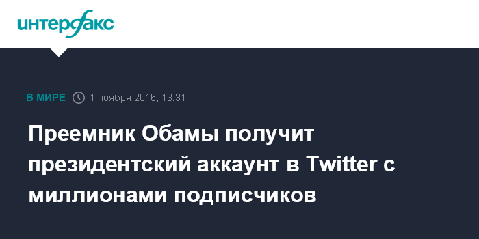 Москва. 1 ноября. INTERFAX.RU - Новый президент США с 20 января 2017 года получит доступ к президентскому аккаунту в Твиттере с уже имеющимися 11 млн подписчиков, сообщают во вторник западные СМИ.