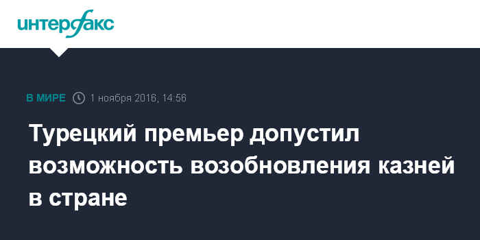 Москва. 1 ноября. INTERFAX.RU - Премьер-министр Турции Бинали Йылдырым заявил во вторник в турецком парламенте, что власти страны могут предложить проект об ограниченном возвращении исполнения смертных приговоров, сообщают западные СМИ.