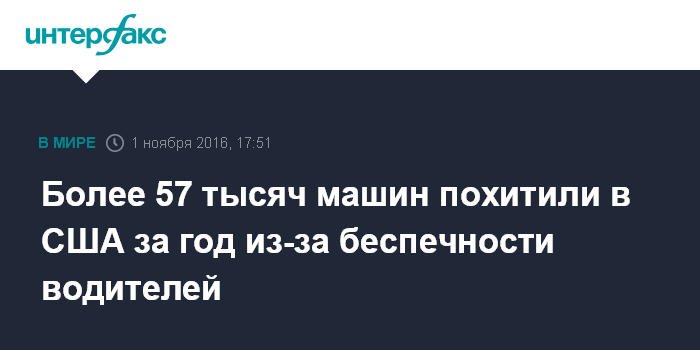Как говорится в отчете Национального бюро страховых преступлений (National Insurance Crime Bureau, NICB), в 2015 году число угонов автомобилей, владельцы которых оставляли дверь открытой и забывали ключи в салоне, подскочило на 22% и достигло 57,1 тыс.